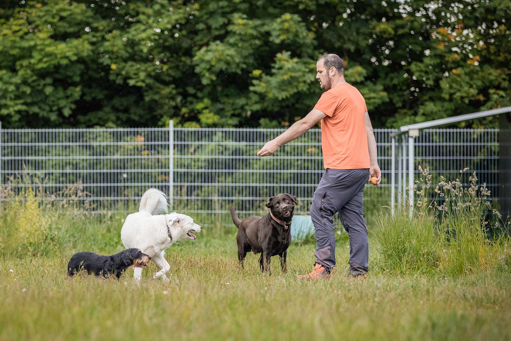 Ich stelle die Gruppen sorgfältig zusammen, beobachte die Hunde und unterstütze, damit das Miteinander gut gelingt.